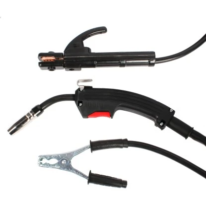 Enthalten ist auch ein 6-teiliges Zubehörset bestehend aus Massekabel mit -klemme, Schweißkabel mit Elektrodenhalter, Schutzgasschweißpistole, Hammer/Bürste, Schweißmaske.