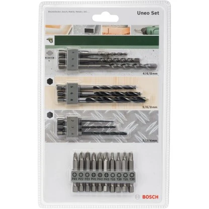Mit dem Bosch Bohrer-Set DIY Uneo Mixed-Set 19-teilig wird der Bosch Uneo zum Allrounder. Die enthaltenen Bohrer sind für Stein, Holz und Metall geeignet.