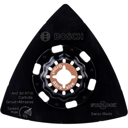 Der Bosch Schleifteller AVZ 90 RT10 Körnung 100 für Multifunktionswerkzeuge Ø 90 mm eignet sich ideal beim Entfernen von Mörtel und Fliesenkleber, Fugenmörtel, Teppichkleberrückständen von mineralischen Oberflächen und zum Raspeln von Holz für grobe Formanpassungen. Die mit widerstandsfähigem Hartmetallkorn der Körnung 20 besetzte Schleifkante sorgt für eine hohe Verschleißresistenz und lange Nutzungsdauer und der offene Hartmetallbesatz ermöglicht Ihnen einen starken Metallabtrag ohne Zusetzen oder Ablagerung. Der deltaförmige Teller macht exakte Schleifarbeiten auch in schwer zugänglichen Ecken möglich und das Profi-Aufnahmesystem für den Teller sorgt zudem für eine maximale Kraftübertragung zwischen Maschine und Zubehör.