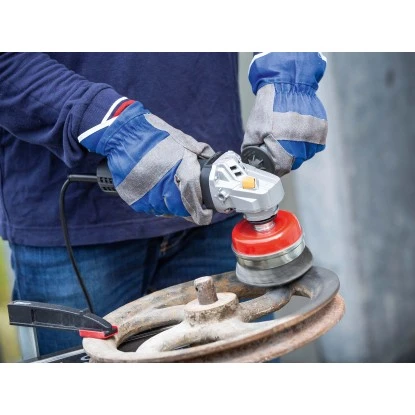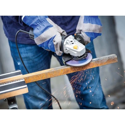 Der CMI Winkelschleifer C-WIS-850/125 eignet sich zur Durchführung von Trenn- und Schleifarbeiten von Metall und Stein. Das Gerät verfügt über eine Leistung von 850 W bei einer Leerlaufdrehzahl von 12.000/min (Umdrehungen). Der Seitengriff ermöglicht ein leichtes und präzises Arbeiten. Der Durchmesser der Schleifscheibe beträgt 125 mm. Mithilfe des M14-Spindel-Gewindes erfolgt die Montage leichtgängig durch Aufstecken und Verschrauben. Die Kabellänge beträgt 2 m. Die enthaltene Schleifhaube dient zum Schutz und besitzt eine Schnellspannfunktion. Zusätzlich ist ein Maulschlüssel enthalten, mit dem Aufsätze arretiert werden können.