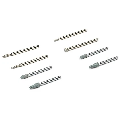 Im Set enthalten sind je 1 Siliziumkarbid-Schleifstein 3,2 mm (83322), Siliziumkarbid-Schleifstein 4,8 mm (84922), Diamantbestückter Fräser 2 mm (7103), Diamantbestückter Fräser 4,4 mm (7105), Diamantbestückter Fräser 2,4 mm (7144), Diamantbestückter Fräser 2,0 mm (7134), Diamantbestückter Fräser 2,0 mm (7134) und Diamantbestückter Fräser 2,0 mm (7134).