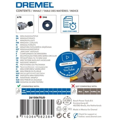 Mit dem Dremel Kreissägenvorsatzgerät 670 wird das Dremel Multifunktionswerkzeug (separat erhältlich) im Handumdrehen in eine tragbare Hochgeschwindigkeits-Kreissäge verwandelt. Das Kreissägenvorsatzgerät erlaubt 6,35 mm tiefe, gerade Schnitte in Holz oder holzähnlichen Materialien wie Laminat. Der abgeschrägte Fuß des Kreissägenvorsatzgeräts verhindert, dass der Körper des Dremel Multifunktionswerkzeugs beim Schneiden im Weg ist.