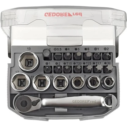 Die Bit-Knarre ist feinverzahnt und verfügt über einen Rechts-/Linkslauf mit Hebelumschaltung und einem Rückschwenkwinkel von 5°. Der Bithalter nach DIN3124 ist magnetisch und für die Bitaufnahme von 6,3 mm (1/4″) geeignet. Die insgesamt 7 kurzen metrischen Sechskant Steckschlüsseleinsätze haben Schlüsselweiten von 6 mm – 13 mm. Die insgesamt 14 Bits sind SL 5,5, PH 1 und 2, PZ 1 und 2, TX T15, T20, T25, T27, T30 und Innen-Sechskant 4 mm, 5 mm und 6 mm. Die Oberfläche ist matt satiniert verchromt. Ein Qualitätsprodukt made by Gedore.