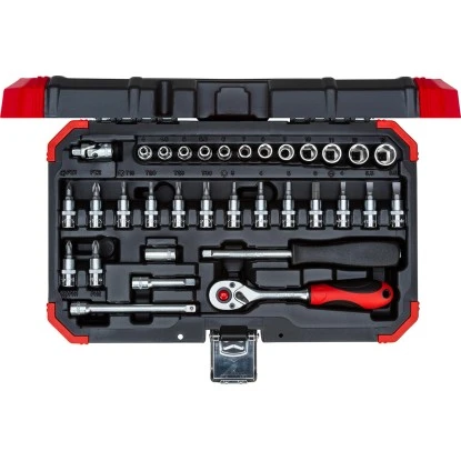 Der 33-teilige Gedore Steckschlüssel Satz R49003033 ist nach DIN gefertigt. Das gesamte Set hat einen 6,3 mm (1/4″) Innenvierkant-Antrieb. Es wird in einem praktischen Koffer mit Metallscharnieren und Verschlüssen mit klemmgesicherten Werkzeugen geliefert. Die Beschriftung im Koffer ermöglicht ein rasches Finden der passenden Einsätze oder Bits. Die Umschaltknarre verfügt über einen Rechts-/Linkslauf mit Hebelumschaltung und einem Rückschwenkwinkel von 5°. Sie ist feinverzahnt mit 72 Zähnen.