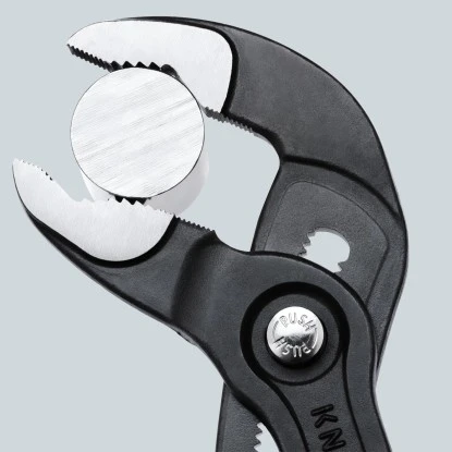 Die Knipex Cobra grau atramentiert 300 mm mit handfreundlicher Griffstellung verfügt über eine Feinverstellung für eine optimale Anpassung an verschiedene Werkstückgrößen. Per Knopfdruck können die Einstellungen direkt am Werkstück vorgenommen werden.