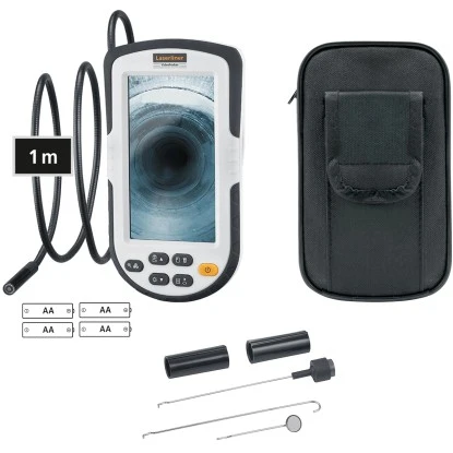 Das Laserliner Videoinspektionssystem VideoPocket ermöglicht einfache visuelle Untersuchungen von schwer erreichbaren Stellen, unter anderem in Rohrleitungen, abgehängten Decken und Kraftfahrzeugen. Während des Einsatzes sorgen sechs Hochleistungs-LEDs an der wasserdichten Kameraeinheit für eine effektive, in zehn Stufen einstellbare Objektbeleuchtung. Details lassen sich über die Zoom-Funktion klar erfassen. Dank des großen Farbdisplays und der Bildausrichtung sind die Inspektionsergebnisse optimal erkennbar. Per Bildvergleichsfunktion können Anwender die Unterschiede zwischen dem Live-Bild und einem gespeicherten Referenzbild direkt feststellen. Die Dokumentation der Bild- und Videoaufnahmen kann mit dem internen Fotospeicher und einer Micro-SD-Karte erfolgen. Aufgrund der geringen Größe überzeugt das Gerät durch ausgezeichnete Handlichkeit und Transportfähigkeit. Mit den Magnet- und Hakenaufsätzen können schwer erreichbare Gegenstände angezogen und angehoben werden. Der Spiegelaufsatz erlaubt es, Objekte im 90° Winkel zu betrachten.