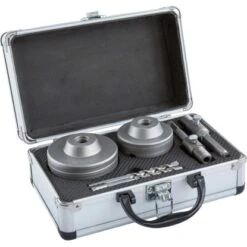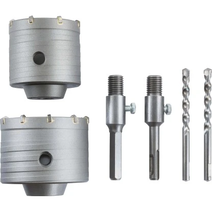 Das 6-teilige LUX-TOOLS Bohrkronen-Set dient dem Bohren in Stein, Mauerwerk oder Beton und kann auch im Schlagbetrieb eingesetzt werden. Es beinhaltet zwei Bohrkronen (Ø 68 mm und Ø 82 mm), zwei HM Zentrierbohrer (Ø 8 mm), ein SDS-Adapter (M16 Gewinde) und einen Sechskant-Adapter (M16 Gewinde). Das Set wird in einem praktischen Transportkoffer aus Aluminium geliefert.