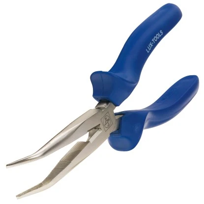Die LUX-TOOLS Telefonzange gebogen mit 45° gebogenem Kopf ist aus Werkzeugstahl geschmiedet, mit verchromtem Oberflächenfinish und Kunststoffgriffen. Die Länge beträgt 200 mm.