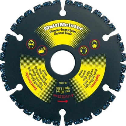 Die Trennscheibe Multimeister ist eine multifunktionale Trennscheibe für Winkelschleifer. Sie ist für Metall, Holz (inkl. Nägel), Glasfaserkunststoffe, Kunststoffrohre und -profile und bedingt auch fur Betonschnitte geeignet.